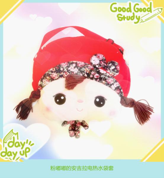 一成不变的工作生活,乏味的让人们爱上了自然,爱上了外出旅游。但是大多数人迫于生活的压力只能坚守自己的位置,生活在高楼林立的长方形或是正方形规规矩矩的城市里。为寻求心中追求快乐的小小想法,出不去只能改变日常生活中的小物来提升生活的幸福感。安吉拉是中国女孩们的快乐天使,她永远走在流行时尚的前沿,洞察着中国女孩们对快乐幸福的需求。日常使用的电热水袋套,总是平淡无奇,扎着两个小辫子的安吉拉电热水袋套虽然只是电热水袋的配角,但是配角也要精彩的演绎。100%的棉质布料的安吉拉,内部填充物为棉花或PP棉是个胖嘟嘟的小女孩,传递着洁白PP棉的温暖,是个小可爱的暖手包。不装电热水袋的时候还能装一些可爱的小物件,女孩爱她,小孩子们也非常喜欢背着安吉拉去玩。