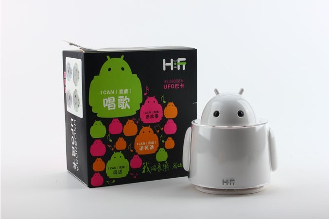 如今,很多USB的小音箱都创意十足,时尚新奇的设计总让人猜不出个究竟,苹果型的,KT猫型等……如果没有那个链接线,就凭外表的形状状确实很难和小音箱联系起来。这款Hi听语音智能机器人音响 UFO巴卡迷你小音箱拥有USB接口,插在电脑上既有观赏性又实用。它有着超强的语音识别能力,可以顺畅自然的和你进行语音交流。是一个多功能的机器人迷你小音箱哦。他外表小巧,功能强大,并且内置锂电池,也可以用USB接口,是旅行、娱乐、办公的好伴侣。如果放在办公桌上,不仅能吸引大家的眼球,而且能让音乐无处不在,随时随地享受。