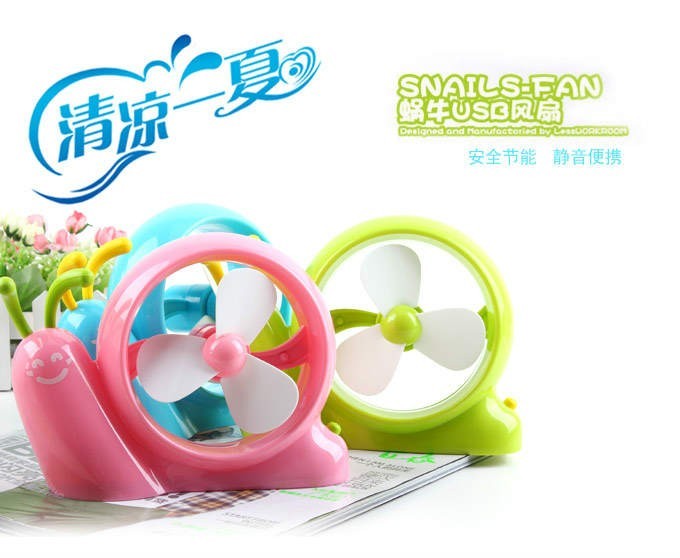 转眼间夏天到来了,尤其是许多气候温暖的地方都进入了中暑期,这个时候,你的桌面上怎么能少了一款可爱有趣又实用的小风扇呢。这款微笑着的蜗牛风扇,它的笑脸不仅能给你带来好的心情,还可以随意摆动他的触角形状,让您在心情不好时得到释放。别看它是小小的蜗牛,可它的风力真不的容小瞧。超强的马力,可爱的造型,让这个小小的蜗牛成为了当下最火热的USB风扇。一个笑脸,二对触角,三只软质的扇页,在这个炎热的夏天为你送上徐徐清凉