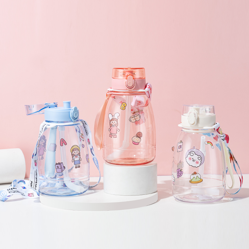 1100ML可爱便携背带塑料杯大容量吸管水杯送贴纸