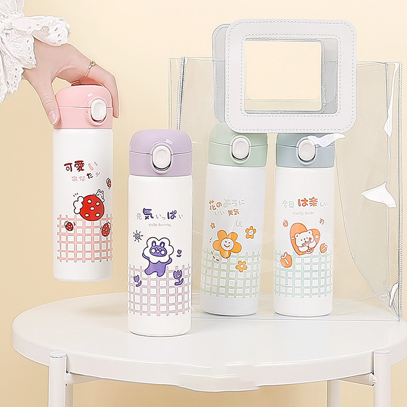 380ml简约日系格纹保温杯304不锈钢弹跳盖可爱水杯子
