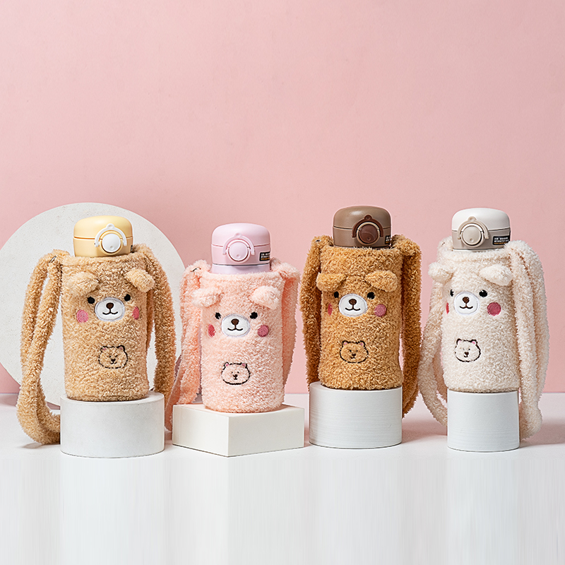 350ML美乐小熊全脸毛绒套保温杯304不锈钢吸管水杯