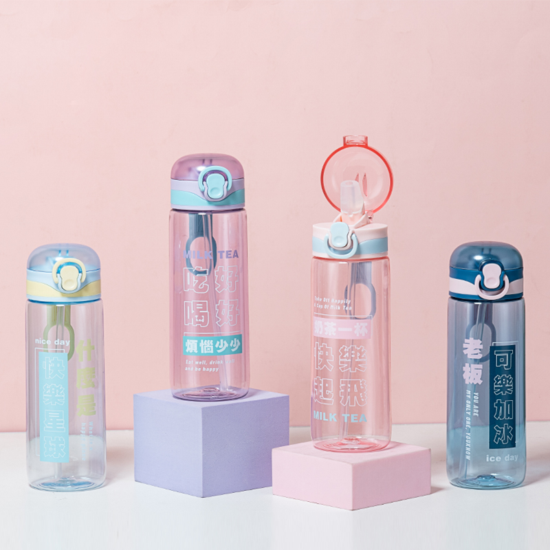 600ML创意文字弹盖塑料杯学生便携户外运动吸管水杯