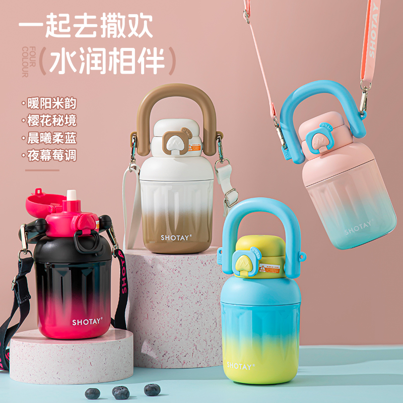 550ML卡通儿童背带吸管塑料杯弹跳盖宝宝学饮杯子